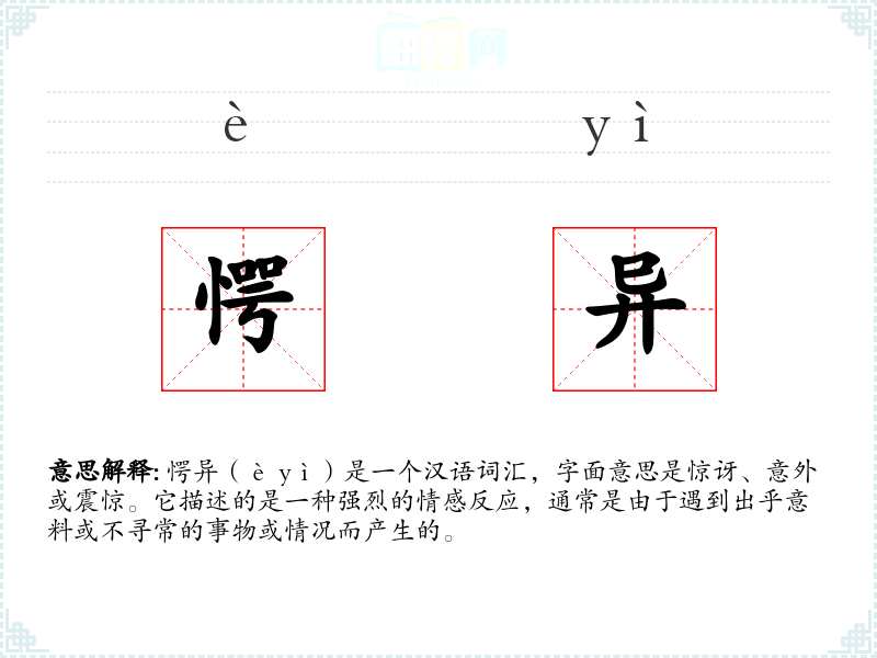 愕异(è yì)是一个汉语词汇,字面意思是惊讶、意外或震惊。它描述的是一种强烈的情感反应,通常是由于遇到出乎意料或不寻常的事物或情况而产生的。