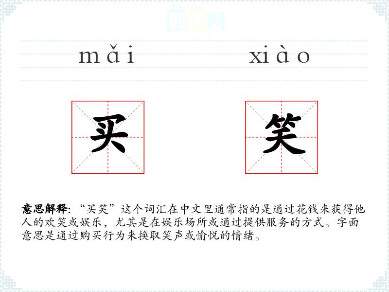“买笑”这个词汇在中文里通常指的是通过花钱来获得他人的欢笑或娱乐,尤其是在娱乐场所或通过提供服务的方式。字面意思是通过购买行为来换取笑声或愉悦的情绪。