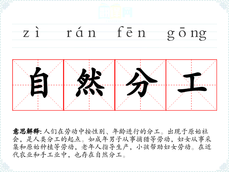 1.人们在劳动中按性别、年龄进行的分工。出现于原始社会,是人类分工的起点。如成年男子从事捕猎等劳动,妇女从事采集和原始种植等劳动,老年人指导生产,小孩帮助妇女劳动。在近代农业和手工业中,也存在自然分工。
