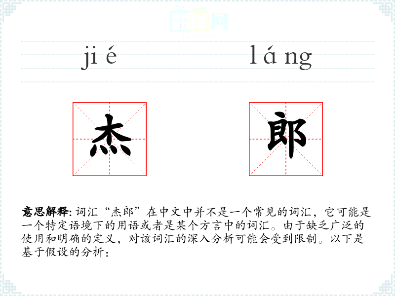 - 由于“杰郎”不是一个标准汉语词汇,其词源和演变可能不明确。它可能是由“杰”和“郎”两个字组合而成的新词,或者是某个特定地区的方言词汇。