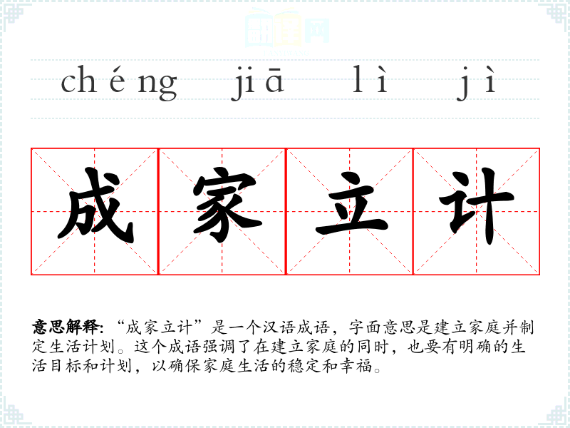 “成家立计”是一个汉语成语,字面意思是建立家庭并制定生活计划。这个成语强调了在建立家庭的同时,也要有明确的生活目标和计划,以确保家庭生活的稳定和幸福。