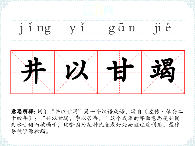 词汇“井以甘竭”是一个汉语成语,源自《左传·僖公二十四年》:“井以甘竭,李以苦存。”这个成语的字面意思是井因为水甘甜而被喝干,比喻因为某种优点或好处而被过度利用,最终导致资源枯竭。
