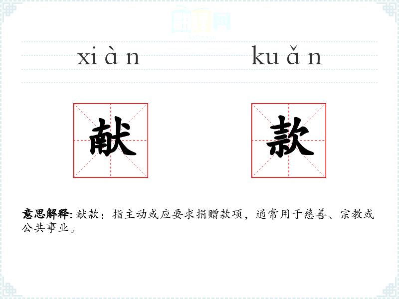 献款:指主动或应要求捐赠款项,通常用于慈善、**或公共事业。
