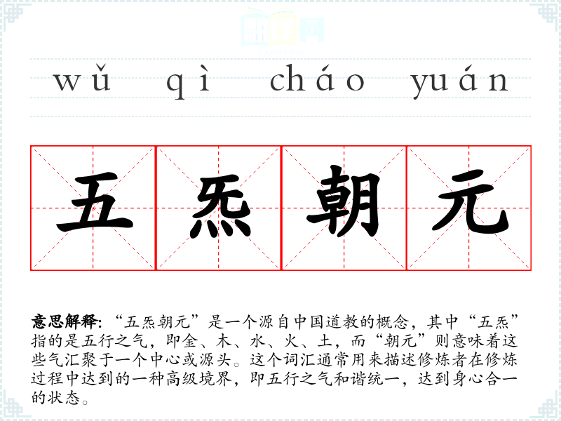 “五炁朝元”是一个源自**道教的概念,其中“五炁”指的是五行之气,即金、木、水、火、土,而“朝元”则意味着这些气汇聚于一个中心或源头。这个词汇通常用来描述修炼者在修炼过程中达到的一种高级境界,即五行之气和谐统一,达到身心合一的状态。