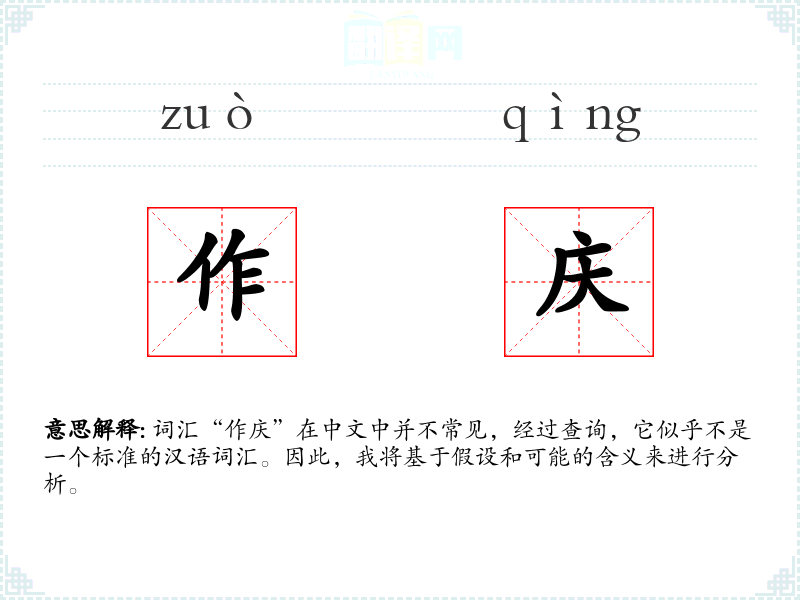 词汇“作庆”在中文中并不常见,经过查询,它似乎不是一个标准的汉语词汇。因此,我将基于假设和可能的含义来进行分析。