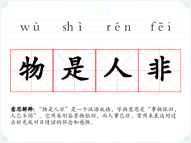 “物是人非”是一个汉语成语,字面意思是“事物依旧,人已不同”。它用来形容景物依旧,而人事已非,常用来表达对过去时光或旧日情谊的怀念和感慨。