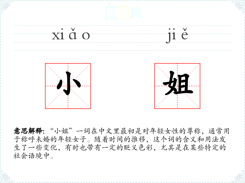 “小姐”一词在中文里最初是对年轻女性的尊称,通常用于称呼未婚的年轻女子。随着时间的推移,这个词的含义和用法发生了一些变化,有时也带有一定的贬义色彩,尤其是在某些特定的社会语境中。