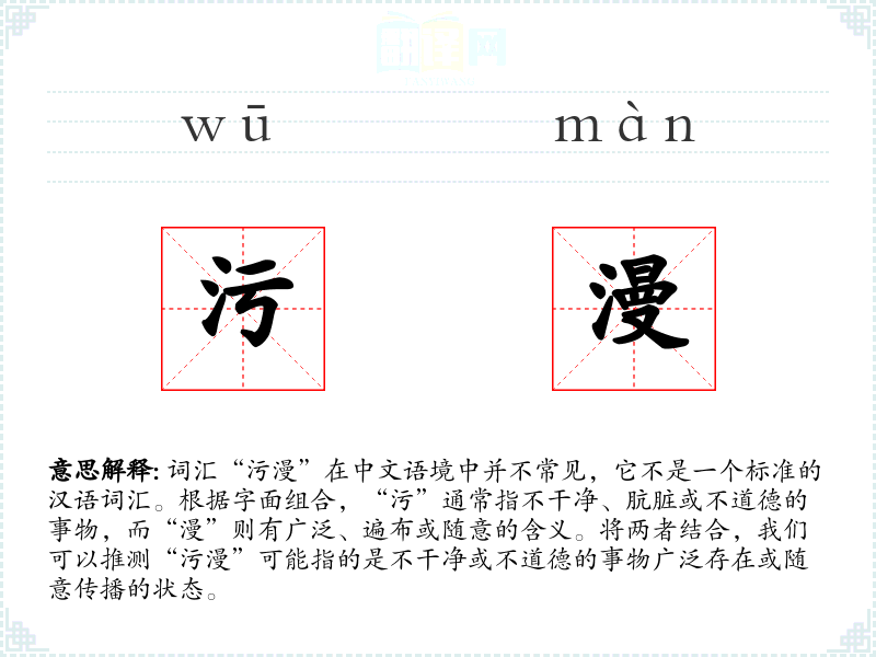 “污漫”这个词汇虽然不常见,但它提供了一种描述不干净或不道德事物广泛存在的方式。在语言学习和表达中,了解和掌握这样的词汇可以帮助我们更准确地表达复杂的概念和情感。