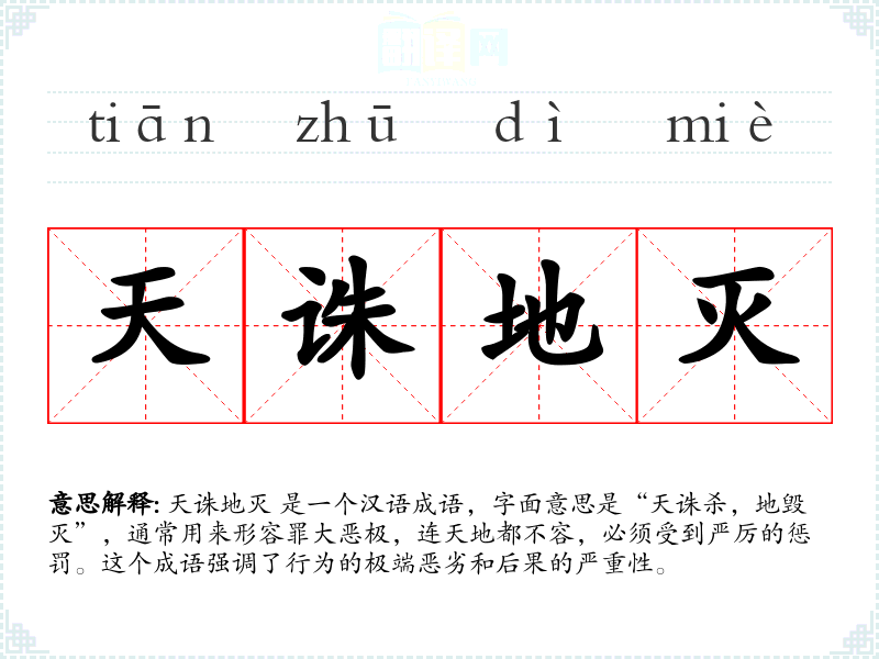 天诛地灭 是一个汉语成语,字面意思是“天诛杀,地毁灭”,通常用来形容罪大恶极,连天地都不容,必须受到严厉的惩罚。这个成语强调了行为的极端恶劣和后果的严重性。