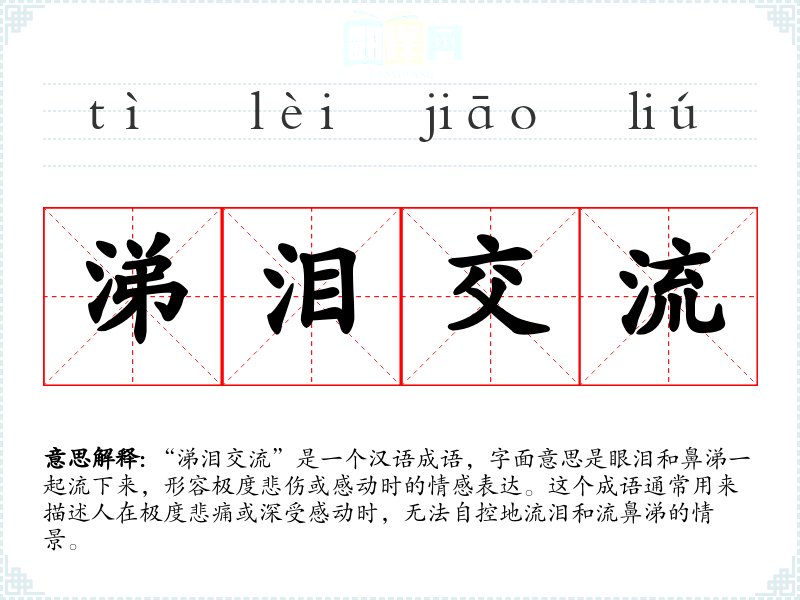 在文学作品中,“涕泪交流”常用于描绘人物在失去亲人、经历重大变故或深受感动时的情感反应。在口语中,这个成语也可以用来形容某人因为极度悲伤或感动而流泪的情况。在专业领域,如心理学或情感研究中,这个词汇可能被用来描述情感表达的一种极端形式。