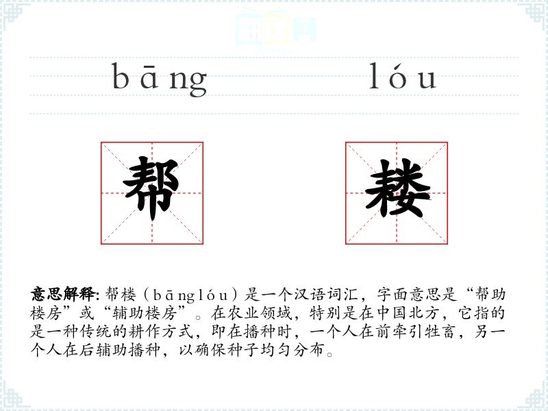 帮楼(bāng lóu)是一个汉语词汇,字面意思是“帮助楼房”或“辅助楼房”。在农业领域,特别是在**北方,它指的是一种传统的耕作方式,即在播种时,一个人在前牵引牲畜,另一个人在后辅助播种,以确保种子均匀分布。