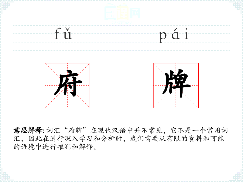 词汇“府牌”在现代汉语中并不常见,它不是一个常用词汇,因此在进行深入学*和分析时,我们需要从有限的资料和可能的语境中进行推测和解释。