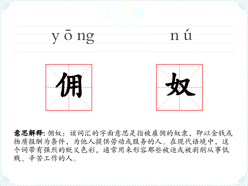 佣奴:该词汇的字面意思是指被雇佣的奴隶,即以金钱或物质报酬为条件,为他人提供劳动或服务的人。在现代语境中,这个词带有强烈的贬义色彩,通常用来形容那些被迫或被剥削从事低贱、辛苦工作的人。