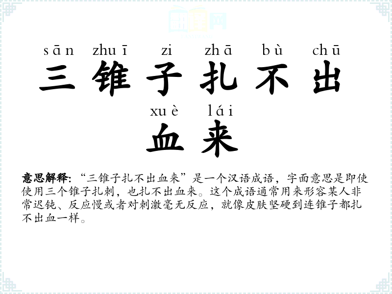 “三锥子扎不出血来”是一个汉语成语,字面意思是即使使用三个锥子扎刺,也扎不出血来。这个成语通常用来形容某人非常迟钝、反应慢或者对刺激毫无反应,就像皮肤坚硬到连锥子都扎不出血一样。