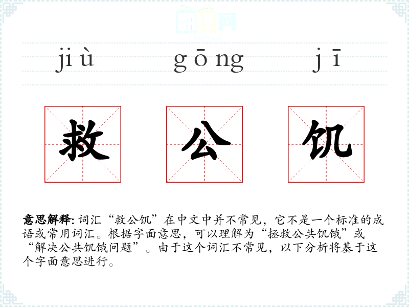 词汇“救公饥”在中文中并不常见,它不是一个标准的成语或常用词汇。根据字面意思,可以理解为“拯救公共饥饿”或“解决公共饥饿问题”。由于这个词汇不常见,以下分析将基于这个字面意思进行。