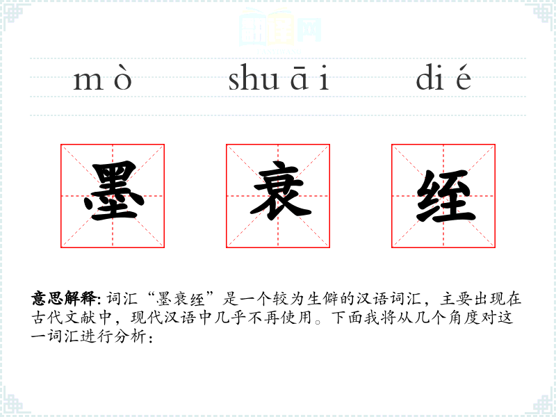 词汇“墨衰绖”是一个较为生僻的汉语词汇,主要出现在古代文献中,现代汉语中几乎不再使用。下面我将从几个角度对这一词汇进行分析: