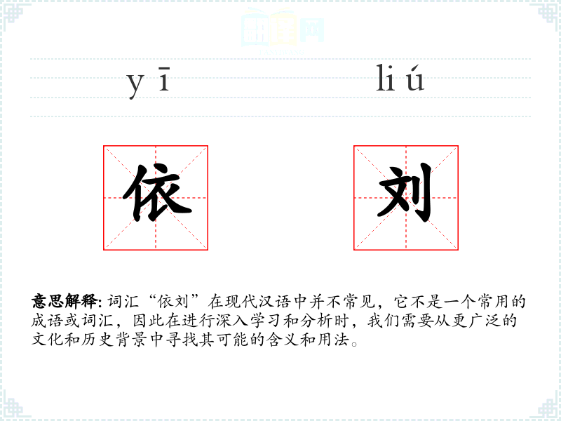 由于“依刘”不是一个标准的汉语词汇,我们无法提供一个确切的字面意思和基本含义。它可能是某个特定方言、古文中的词汇,或者是某个特定文化背景下的用语。
