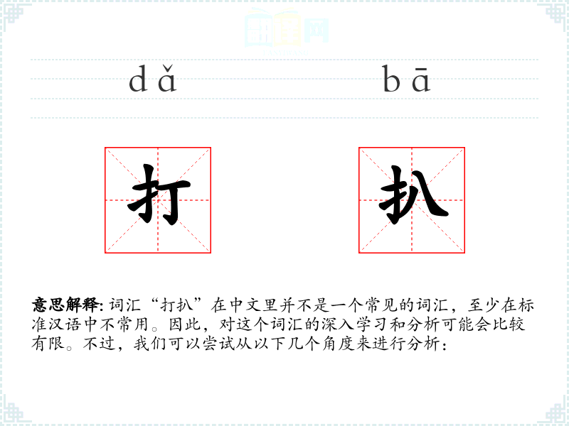 词汇“打扒”在中文里并不是一个常见的词汇,至少在标准汉语中不常用。因此,对这个词汇的深入学习和分析可能会比较有限。不过,我们可以尝试从以下几个角度来进行分析: