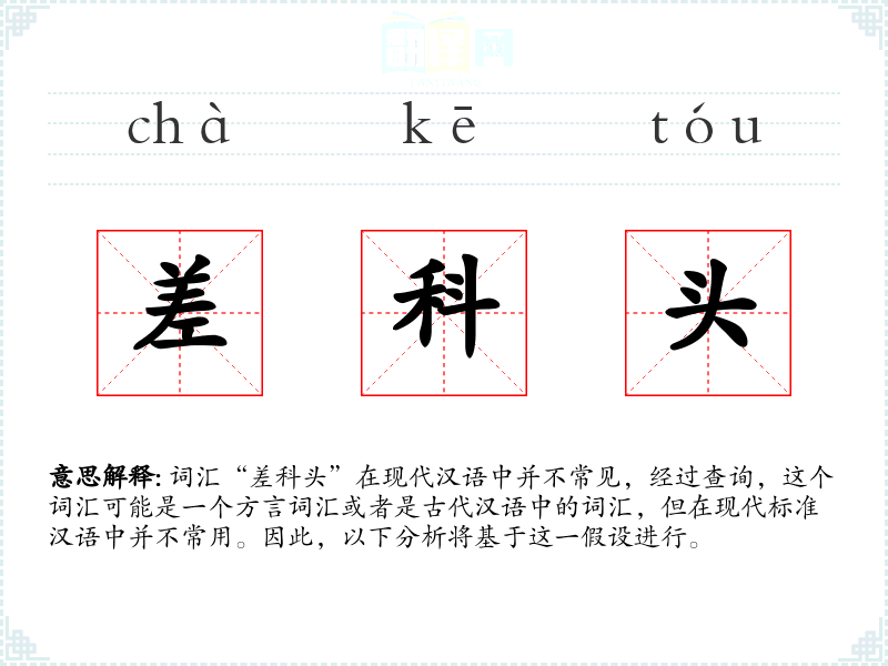 词汇“差科头”在现代汉语中并不常见,经过查询,这个词汇可能是一个方言词汇或者是古代汉语中的词汇,但在现代标准汉语中并不常用。因此,以下分析将基于这一假设进行。
