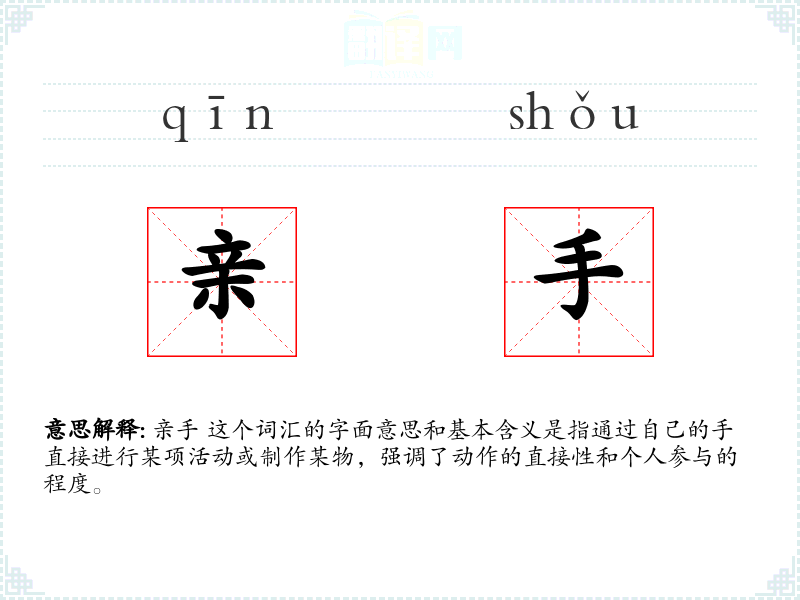 亲手 这个词汇的字面意思和基本含义是指通过自己的手直接进行某项活动或制作某物,强调了动作的直接性和个人参与的程度。