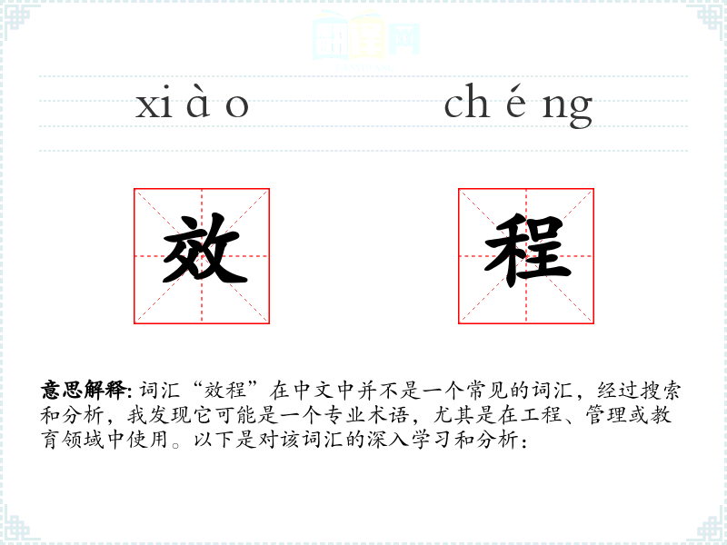 词汇“效程”在中文中并不是一个常见的词汇,经过搜索和分析,我发现它可能是一个专业术语,尤其是在工程、管理或教育领域中使用。以下是对该词汇的深入学习和分析: