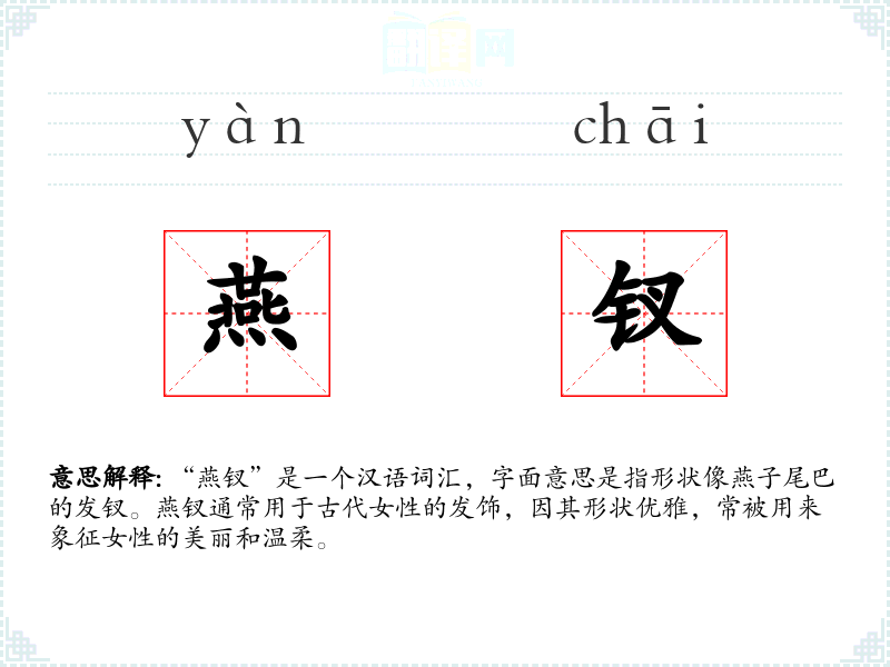 “燕钗”是一个汉语词汇,字面意思是指形状像燕子尾巴的发钗。燕钗通常用于古代女性的发饰,因其形状优雅,常被用来象征女性的美丽和温柔。