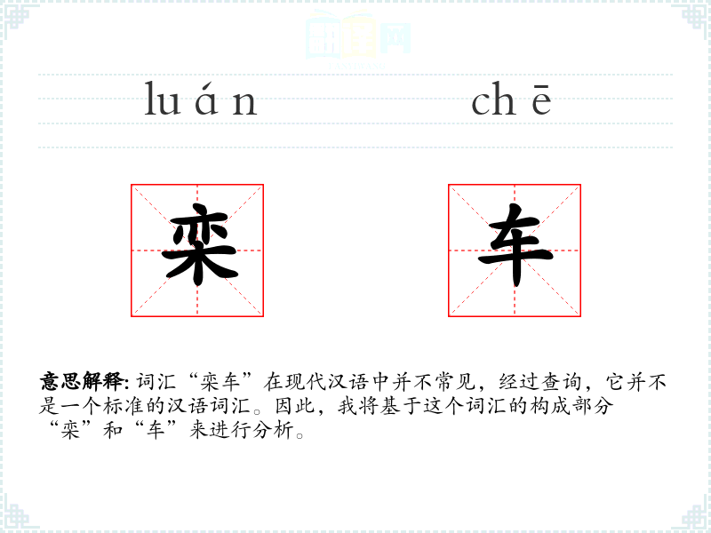 “栾”字在古代文献中有时指代某种建筑结构或器物,而“车”字自古以来就指车辆。将两者结合的“栾车”可能是对古代某种特殊车辆的描述,但具体含义需要更多历史文献的支持。