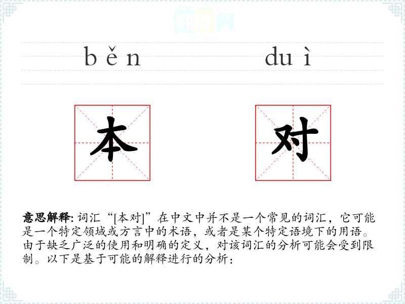 词汇“[本对]”在中文中并不是一个常见的词汇,它可能是一个特定领域或方言中的术语,或者是某个特定语境下的用语。由于缺乏广泛的使用和明确的定义,对该词汇的分析可能会受到限制。以下是基于可能的解释进行的分析: