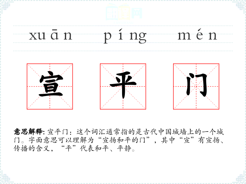 宣平门:这个词汇通常指的是古代**城墙上的一个城门。字面意思可以理解为“宣扬和平的门”,其中“宣”有宣扬、传播的含义,“平”代表和平、平静。