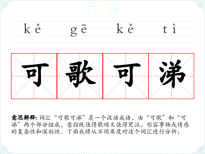 词汇“可歌可涕”是一个汉语成语,由“可歌”和“可涕”两个部分组成,意指既值得歌颂又值得哭泣,形容事物或情感的复杂性和深刻性。下面我将从不同角度对这个词汇进行分析: