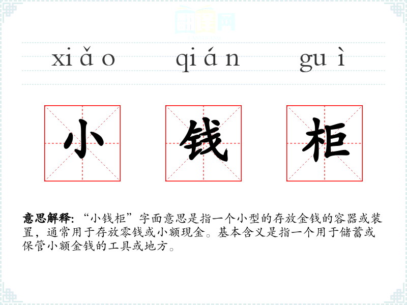 “小钱柜”字面意思是指一个小型的存放金钱的容器或装置,通常用于存放零钱或小额现金。基本含义是指一个用于储蓄或保管小额金钱的工具或地方。