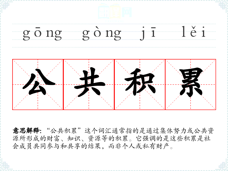 “公共积累”这个词汇通常指的是通过集体努力或公共资源所形成的财富、知识、资源等的积累。它强调的是这些积累是社会成员共同参与和共享的结果,而非个人或私有财产。