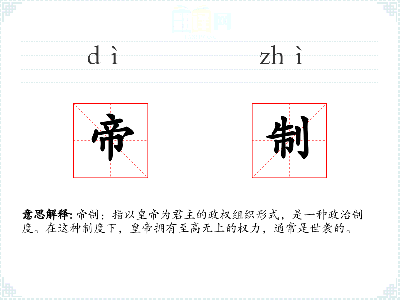 - 词源:“帝制”一词源于汉语,其中“帝”指**,“制”指制度或体制。