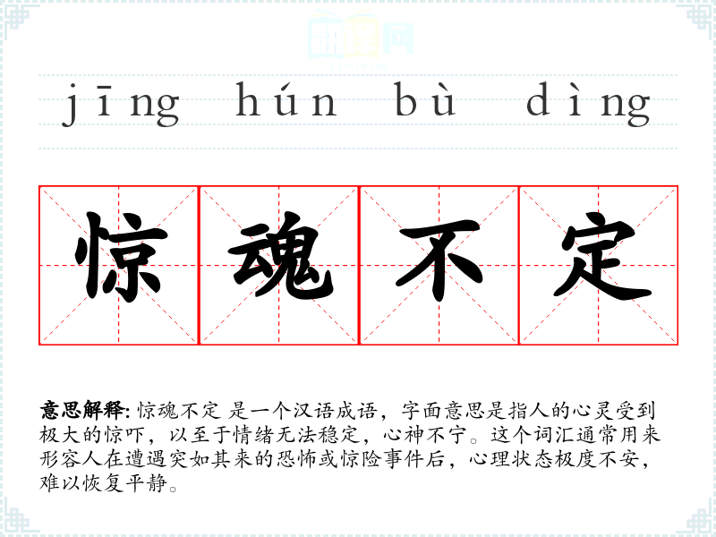 惊魂不定 是一个汉语成语,字面意思是指人的心灵受到极大的惊吓,以至于情绪无法稳定,心神不宁。这个词汇通常用来形容人在遭遇突如其来的恐怖或惊险**后,心理状态极度不安,难以恢复平静。
