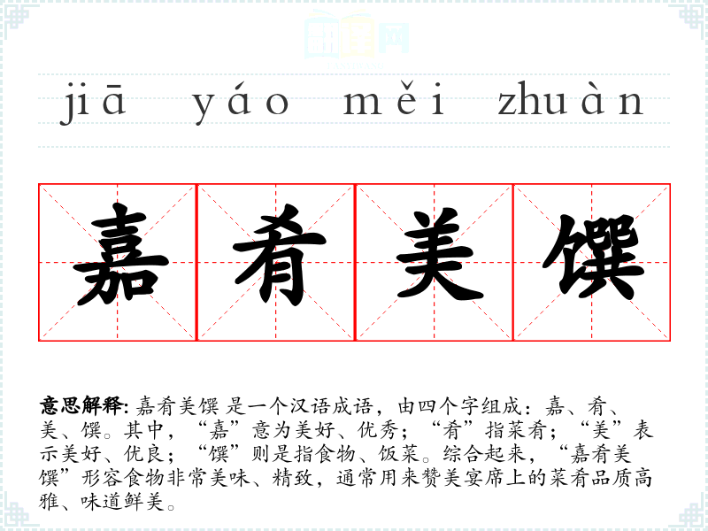 嘉肴美馔 是一个汉语成语,由四个字组成:嘉、肴、美、馔。其中,“嘉”意为美好、优秀;“肴”指菜肴;“美”表示美好、优良;“馔”则是指食物、饭菜。综合起来,“嘉肴美馔”形容食物非常美味、精致,通常用来赞美宴席上的菜肴品质高雅、味道鲜美。