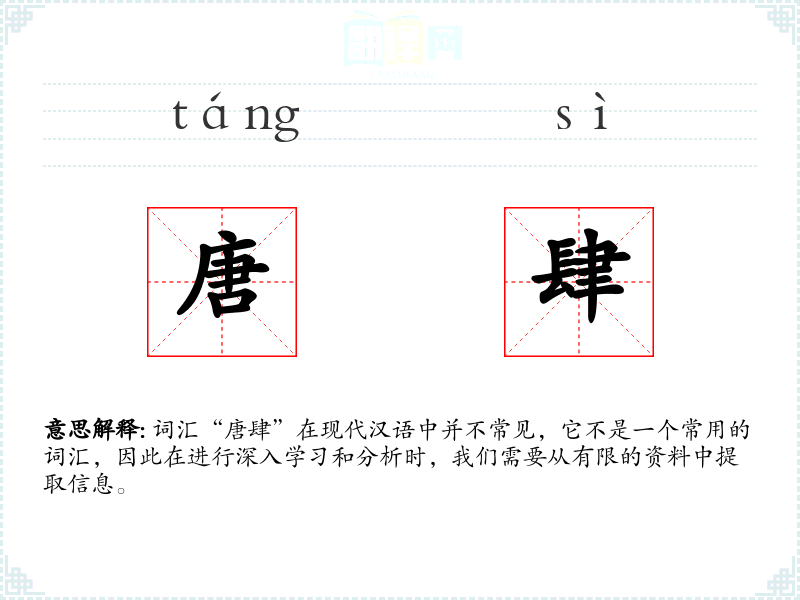 词汇“唐肆”在现代汉语中并不常见,它不是一个常用的词汇,因此在进行深入学*和分析时,我们需要从有限的资料中提取信息。