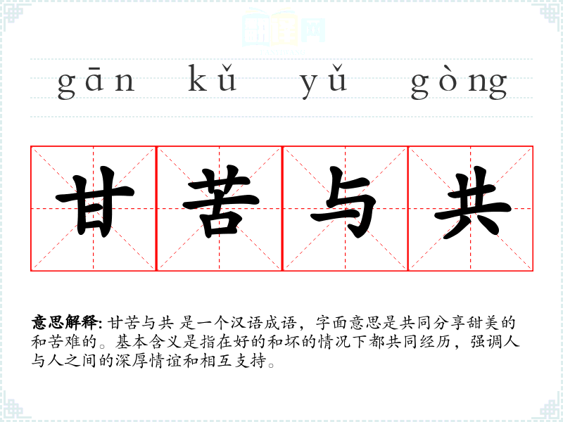 甘苦与共 是一个汉语成语,字面意思是共同分享甜美的和苦难的。基本含义是指在好的和坏的情况下都共同经历,强调人与人之间的深厚情谊和相互支持。