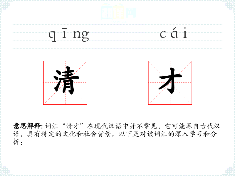 词汇“清才”在现代汉语中并不常见,它可能源自古代汉语,具有特定的文化和社会背景。以下是对该词汇的深入学*和分析:
