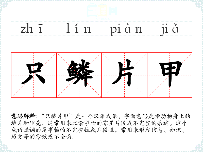 “只鳞片甲”是一个汉语成语,字面意思是指动物身上的鳞片和甲壳,通常用来比喻事物的零星片段或不完整的痕迹。这个成语强调的是事物的不完整性或片段性,常用来形容信息、知识、历史等的零散或不全面。