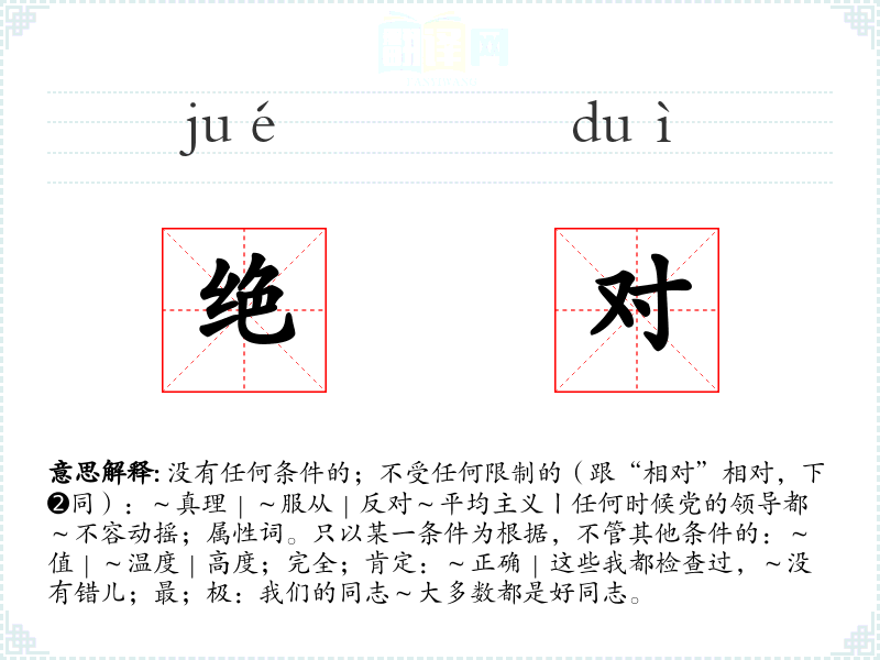 1.没有任何条件的;不受任何限制的(跟“相对”相对,下➋同):~真理|~服从|反对~平均主义丨任何时候党的领导都~不容动摇;属性词。只以某一条件为根据,不管其他条件的:~值|~温度|高度;完全;肯定:~正确|这些我都检查过,~没有错儿;最;极:我们的同志~大多数都是好同志。