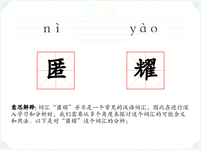 词汇“匿耀”并不是一个常见的汉语词汇,因此在进行深入学习和分析时,我们需要从多个角度来探讨这个词汇的可能含义和用法。以下是对“匿耀”这个词汇的分析: