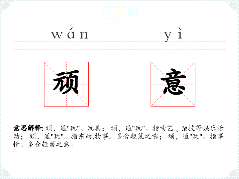 顽,通"玩"。玩具; 顽,通"玩"。指曲艺﹑杂技等娱乐活动; 顽,通"玩"。指东西;物事。多含轻蔑之意; 顽,通"玩"。指事情。多含轻蔑之意。