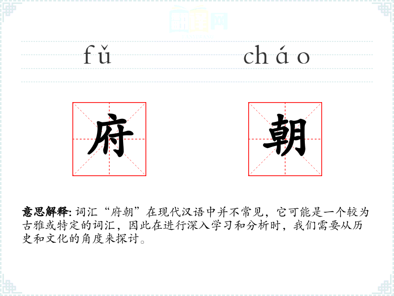 词汇“府朝”在现代汉语中并不常见,它可能是一个较为古雅或特定的词汇,因此在进行深入学*和分析时,我们需要从历史和文化的角度来探讨。