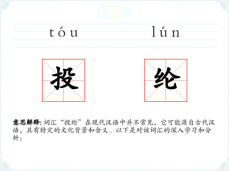 词汇“投纶”在现代汉语中并不常见,它可能源自古代汉语,具有特定的文化背景和含义。以下是对该词汇的深入学*和分析: