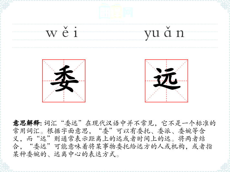由于“委远”不是一个常用词汇,它的词源和历史演变并不明确。可能是由“委”和“远”两个字组合而成,用于特定语境下的表达。