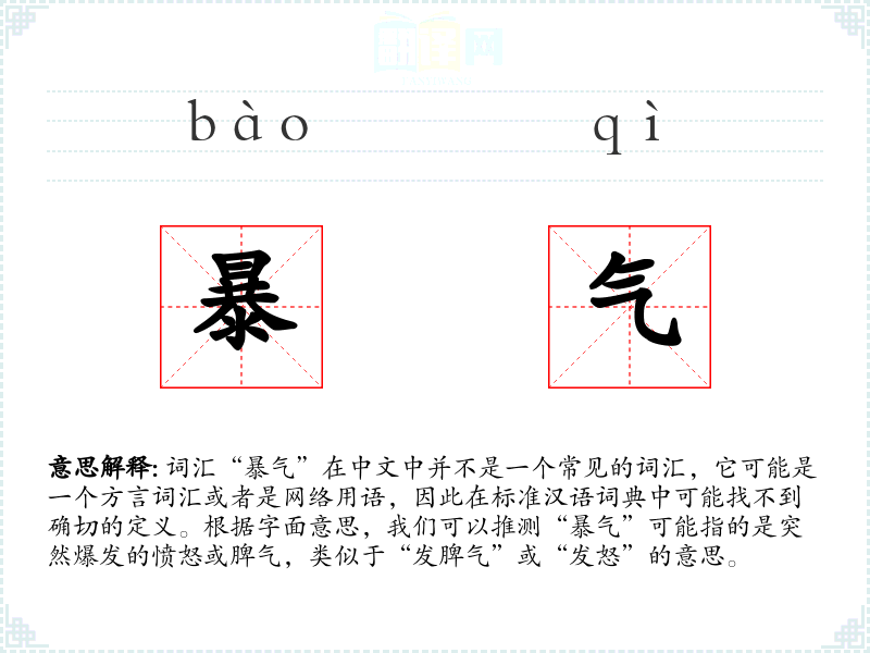 词汇“暴气”在中文中并不是一个常见的词汇,它可能是一个方言词汇或者是网络用语,因此在标准汉语词典中可能找不到确切的定义。根据字面意思,我们可以推测“暴气”可能指的是突然爆发的愤怒或脾气,类似于“发脾气”或“发怒”的意思。