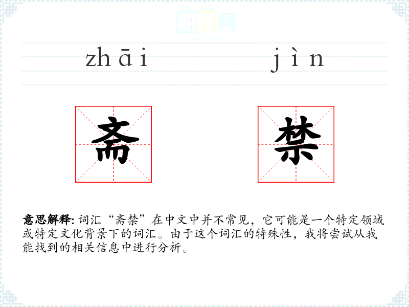词汇“斋禁”在中文中并不常见,它可能是一个特定领域或特定文化背景下的词汇。由于这个词汇的特殊性,我将尝试从我能找到的相关信息中进行分析。
