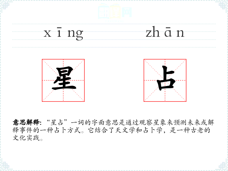 “星占”一词的字面意思是通过观察星象来预测未来或解释**的一种占卜方式。它结合了天文学和占卜学,是一种古老的文化实践。