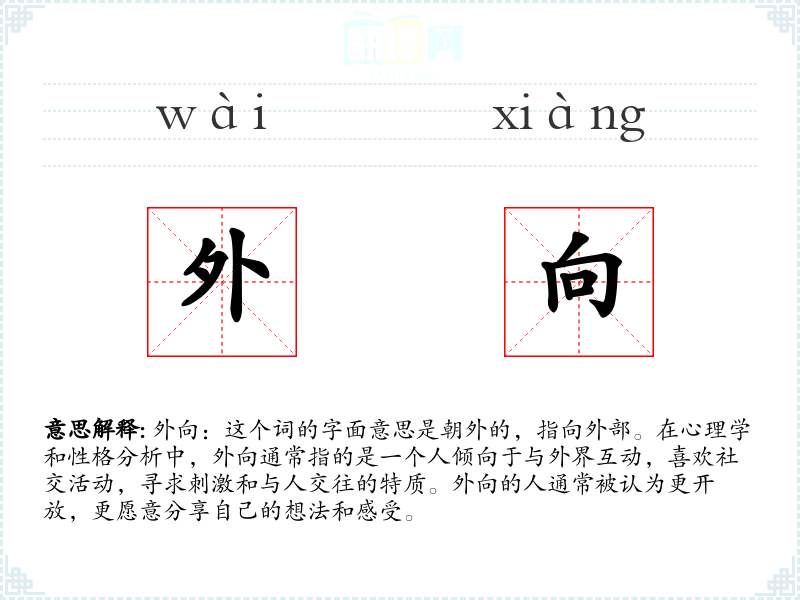 - 专业领域:在心理学领域,外向是五大人格特质之一,与内向相对,用于描述个体的社交倾向。