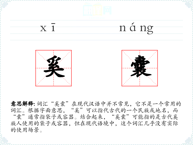 - 词源:“奚”源自古代的一个民族或地名,“囊”源自古代汉语,指袋子或容器。
